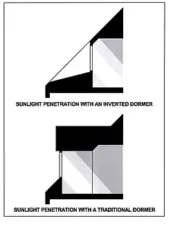 • 21.) Arthur Seyfarth house. This house is another one that features operable exterior shutters. Note the original storm windows, which reproduce the pattern of the muntins on the movable double-hung sash. Note, too, how the inverted dormers here help to maintain the simple geometry of the building. To improve the proportions of this house's large living room, Seyfarth raised its ceiling higher than those of any of the other rooms on the first floor. He inserted built-in drawers into the exterior walls of the second-floor bedrooms beneath the roof to utilize what would otherwise be wasted space and so that the need of case pieces for the storage of clothing was virtually eliminated. This convenience was one that had been promoted by Frank Lloyd Wright in an article in The Architectural Record magazine in 1908 "...The most truly satisfactory apartments are those in which most or all of the furniture is built in as part of the original scheme ...".[145]