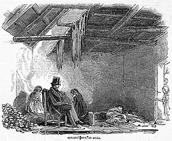 At the outbreak of the Great Famine in 1845 Traill believed that the ventilation of the traditional storage of potatoes in pits would save them from the blight, and he worked on constructing these potato pit air shafts from October 1845.[8] However he realised this would not be successful and by December was trying, in vain, to persuade the local landlords to let their tenants keep some grain so that they weren't forced to eat their seed potatoes.[3] Traill established a relief committee for his parish and wrote widely to persuade people to subscribe to it. He was shown in the Illustrated London News visiting a dying man and his family, having been sketched by James Mahony who said of Traill that "his humanity at the present moment is beyond praise".[3]