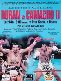 Five years after their previous fight, Héctor Camacho and Roberto Durán agreed to a rematch to take place in July 2001 in the Pepsi Center in Denver, Colorado. The 39-year old Camacho sported a 73–4–2 record but had not fought for a major world title since his 1997 loss to Oscar De La Hoya. Durán, meanwhile, came into the fight at 103–15 but had found himself suspended by the Nevada State Athletic Commission following a blowout loss to WBA middleweight champion William Joppy in 1998.[1] Though he flirted with retirement after the Joppy fight, Durán continued to fight, and unable to fight in United States due to his suspension, fought twice in Latin America before being reinstated by the Nevada State Athletic Commission in August 2000 after passing a neurological examination.[2]