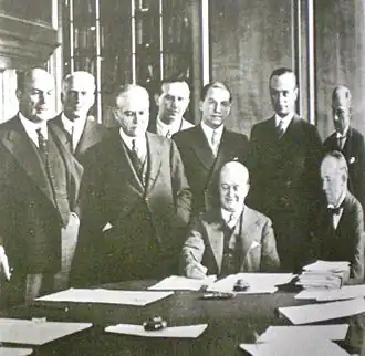 On 1 May 1933, they concluded a bilateral treaty known as the Roca-Runciman Treaty.[2] The Argentine Senate ratified this agreement by Law #11,693. The treaty lasted three years and was renewed as the Eden-Malbrán Treaty of 1936, which gave additional concessions to Britain in return for lower freight rates on wheat.[3][4]