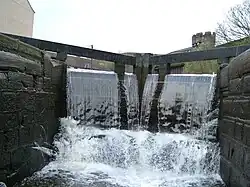 A lock on the Rochdale Canal with water flowing over the gate