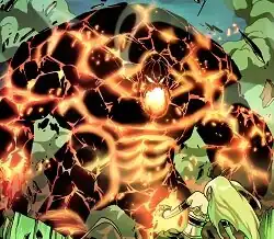 Rockslide can assimilate nearby earth to transform into a rock-like form that gives him superhuman physical abilities. He can also reform himself if destroyed and release explosive blasts of energy.[20][21] Rockslide's appearance in his rock form depends on the material absorbed; for instance, he assumed a molten form after absorbing rock from Limbo.[22]