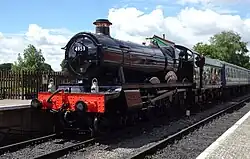 Large Prairie 4141 is a GWR 5101 Class locomotive. Built in 1946 it is a medium-sized tank engine with a 2-6-2T wheel arrangement and was designed for suburban and local passenger trains, often seen with GWR and BR suburban coaches. At time of purchase it had recently received a boiler certificate which would see it run for up to ten years, securing the position of steam when the two other residents' boiler tickets had expired.[2] Arrived at the Epping Ongar Railway in 2012, just in time for the "Santa Specials" in December 2012. It is out of service awaiting boiler repairs.