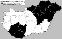 Romani people in Hungary (also known as roma or Romani Hungarians; Hungarian: magyarországi romák, magyar cigányok) are Hungarian citizens of Romani descent. According to the 2011 census, they comprise 3.18% of the total population, which alone makes them the largest minority in the country,[21] although various estimations have put the number of Romani people as high as 8.8% of the total population.[22][6][23] They are sometimes referred as Hungarian Gypsies, but that is sometimes considered to be a racial slur.[24][25][26]