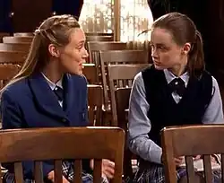 They later spend a summer as roommates during an internship program.[6] When Paris learns that her application to Harvard University has been rejected, Rory is the first person to comfort her.[3] Upon graduating from high school, Rory is elected valedictorian over Paris, and the girls hug before parting ways. They then become roommates at Yale University, supporting one another through a number of issues. During their first spring break, the two kiss while bored in a club. This development garnered immediate interest from viewers and the media.[7][8] Rory later feels that they cannot pursue a romantic relationship, however, because Paris is too "high-maintenance" for her.[1] When Rory drops out of school, Paris grows upset and spends a great deal of time with Rory's mother, Lorelai, labeling Rory her best friend.[9] They eventually graduate together, and Rory declares that they will always be a part of each other's lives.[9] In the spin-off miniseries Gilmore Girls: A Year in the Life, which takes place nearly 10 years later, they are shown to be still close to one another.[10]