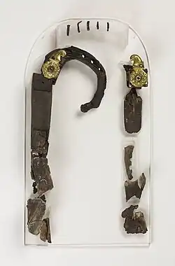 Excavated in 1939, the Sutton Hoo ship burial dates from the early 7th century.[94] The lyre had hung on the western wall of the chamber in a bag made out of beaver-skin.[94] When it fell down, it hit a Coptic bowl and broke into pieces, and fragments from the upper part landed inside the bowl.[94] What survives are the yoke, six tuning pegs, two metal escutcheons fashioned into interlace bird heads that joined the yoke to the hollowed-outside arms, and portions of the side arms.[95]
