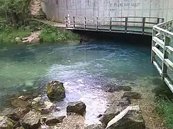 Roubidoux Spring is a second magnitude freshwater spring located within the city limits of Waynesville in the Missouri Ozarks. The spring discharges from the base of a rock ledge that has been capped by a large concrete wall, built to hold the road that passes over the spring. Spring water flows a very short distance before adding its waters to the Roubidoux Creek. A city park with trails and a board walk has been developed around the spring. This spring is noted as having an average discharge of 58.3 ft³/s.[1] However, due to very limited discharge data, an accurate description of the flow of this particular spring may be difficult to find. This could be a first magnitude spring – over 100 ft³/s. According to some lists, this ranks as the 15th largest spring in the state[2]. The area near this spring has very intense karst topography, many caves, springs and large sink holes are present within a few miles of this spring.