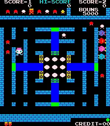 If the player is successful in changing all of the balls in the center to red, the pattern clears and then a new challenge is presented: a 3×3 or 4×4 tri-colored pattern will appear at the bottom of the screen and a slightly different tri-colored cube of corresponding size will appear at the center of the screen. The player may earn bonus points by moving the directional arrow and rearranging the colors of the cube at the center of the screen to match the sample pattern presented at the bottom of the screen. The player is given 90 seconds to rearrange the cube as many times as possible. Action returns to the maze whether the player wins or loses the cube challenge.