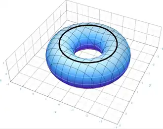 {\displaystyle X(\theta ,\phi )=((2+\cos \theta )\cos \phi ,(2+\cos \theta )\sin \phi ,\sin \theta )\,}