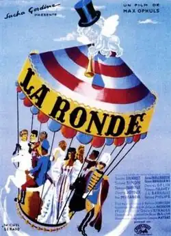 La Ronde is a 1950 French anthology film directed by Max Ophüls and based on the French translation of Arthur Schnitzler's 1897 play Reigen. Set in Vienna in 1900, it shows ten amorous encounters across the social spectrum, from a street prostitute to the nobility, with each scene involving one character from the previous episode. The French term "La Ronde" can mean doing the rounds, a round of drinks, or a circular dance.