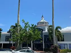 A pre-1923 Sanborn map superimposed over Google Maps imagery indicates that the former site of the Royal Poinciana Hotel is now occupied by the eastbound side of Royal Poinciana Way, Royal Poinciana Plaza, the Palm Beach Tower condominiums, The Breakers golf course, The Breakers human resources building, and Cocoanut Row.[47] Additionally, the greenhouse later became known as the Slat House, stands at 50 Cocoanut Row and is the only remaining part of the Royal Poinciana Hotel. While not part of the main building, the Royal Poinciana Chapel and Seagull Cottage (which pre-dates the Royal Poinciana Hotel), both located on the hotel grounds, remain standing.[48] The Royal Poinciana Hotel tea house is also still intact, although the building has been moved several times and is currently located in Lantana at the Church of the Holy Guardian Angels, where it is now known as the "Chapel of the Holy Spirit".[49]
