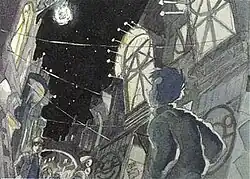In May 1985, Gainax transferred their operations to a larger studio in Takadanobaba, where the existing staff gathered in friends and acquaintances to help visualize the setting of Royal Space Force.[93] Among those joining the crew at this time were two of the film's most prolific world designers: Takashi Watabe, whose designs would include the train station, rocket factory, and Royal Space Force lecture hall[94] and Yoichi Takizawa, whose contributions included the rocket launch gantry, space capsule simulator, and rocket engine test facility.[95] Yamaga decided the alternate world depicted in the pilot film did not have the kind of different realism he was hoping to achieve in the completed work and started over again, creating a new series of "image board" paintings to visualize the look of Royal Space Force. The total worldbuilding process went on for roughly a year, and was described as a converse process between Yamaga and the team of designers; expressing his ideas into concrete terms, but also bringing their concrete skills to bear toward the expression of abstract ideas.[96] This reciprocal process influenced Yamaga's writing on the film: "My style is not 'I have a story I created, so you help me make it.' Creators come first, and this is a story I created thinking what story those creators would shine at the most."[97]