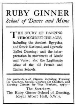 Ginner founded the Ruby Ginner School of Dance in London during World War I.[8] She later partnered with mime Irene Mawer, and the school was known as the Ginner-Mawer School of Dance and Drama.[4][9] Among her students was Australian health advocate Thea Stanley Hughes, Canadian dancer Gweneth Lloyd,[10] actress and dancer Irene Mulvany-Gray[11] (and her sister Hilda Mulvany-Gray)[12] and dance educator Beatrice "Bice" Bellairs.[13] She taught movement to actors at Constance Benson's studio, including a young John Gielgud.[14]