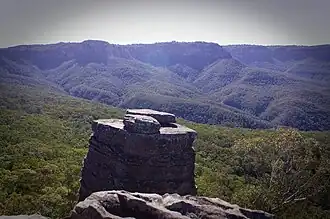 The Ruined Castle is an outcrop of large rocky boulders that lies halfway of a ridge that starts from Castle Head, off Narrow Neck Peninsula, to Mount Solitary. A local elevated point, it is projected from the surrounding bushland, and provides panoramic views of the area.[2]