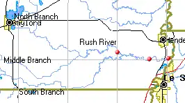 The North Branch Rush River drains from Titlow Lake east of Gaylord, Minnesota, and flows 11.3 miles (18.2 km) southeast,[1] joining the Middle Branch Rush River to form the Rush River.