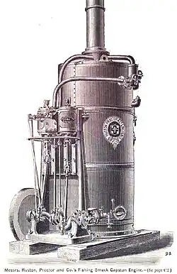 Rustons were primarily steam engineers, manufacturing portable, stationary and traction engines, boilers, and associated engineering products such as winding gear, shafts and pulleys. Threshing machines, clover hullers, corn mills, maize shellers and pumps for steam power were also made. Steam powered winches for sailing trawlers were another product, including boiler, engine, drive shafts and winch bollard.[3] As well as engines for agriculture machines Rustons made railway locomotives, industrial equipment and mining machinery. The company also expanded into electrical and diesel engineering.