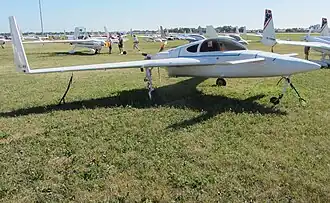The Rutan Model 61 Long-EZ is a tandem 2-seater homebuilt aircraft designed by Burt Rutan's Scaled Composites. The Long-EZ has a canard layout, a swept wing with wingtip rudders, and a pusher engine and propeller. The tricycle landing gear has fixed main wheels with streamlined spats and a retractable nosewheel. Its predecessor was the VariEze, plans for which were first available to homebuilders in 1976. The prototype Long-EZ, N79RA,[3] first flew on June 12, 1979.