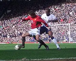 Van Nistelrooy started the 2003–04 season by scoring twice in his first two league matches. This meant he had scored in 10 consecutive league games, then a Premier League record,[35] which stood until 2015 when Jamie Vardy scored in 11 consecutive matches.[36] In the 0–0 draw on 21 September 2003, later dubbed the Battle of Old Trafford, Van Nistelrooy was at the centre of one of the most infamous incidents of the Arsenal–Manchester United rivalry. After missing a last-minute penalty that would have won the game for United,[37] Van Nistelrooy was attacked by Martin Keown, prompting a melee involving several players from both sides; five Arsenal players including Keown received various bans and fines, while the club itself received a record fine of £175,000.[38][39] Earlier in the game, he had been fouled by Patrick Vieira, who was sent off for a second bookable offence. Vieira and his manager Arsène Wenger both accused Van Nistelrooy of cheating and stamping on Vieira,[40][41] prompting a vociferous defence by Alex Ferguson.[42]