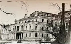 The old castle was a massive square building with a single roof and was surrounded by a moat.[2] After a lightning strike, the old castle burned down in 1827.[2] A new three-storey mansion was built on the same site in 1830,[3] with side wings added between 1867 and 1868.[3] The mansion had around 45 rooms including a large ballroom.[6]