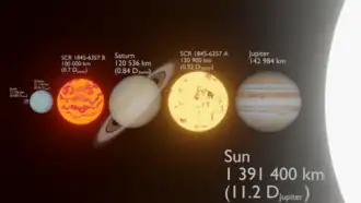 This star has been found to have a brown dwarf companion in 2006, designated SCR 1845-6357 B.[10] The companion has an observed distance of 4.1 AU from the primary and is classified as a T-dwarf.[3] It is estimated to have 25 to 65 times the mass of Jupiter (2.4 to 6.2% of the Sun's mass), but its radius is 30% smaller than that of Jupiter, about 50,000 km (31,000 miles). It has an effective temperature around 1,000 K (730 °C; 1,300 °F).[6]