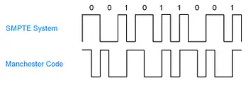 SMPTE timecode signal (A logic value 1 is expressed by a transition at the midpoint of a period. A logic value 0 is expressed by the absence of such a transition.) compared to the outwardly-similar Manchester code (A logic value 0 is expressed by a high-to-low transition, a logic value 1 by low-to-high transition at the midpoint of a period).