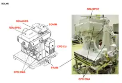 SOLAR[1] was an ESA science observatory on the Columbus Laboratory, which is part of the International Space Station. SOLAR was launched with Columbus in February 2008 aboard STS-122. It was externally mounted to Columbus with the European Technology Exposure Facility (EuTEF). SOLAR has three main space science instruments: SOVIM, SOLSPEC and SOL-ACES.[2] Together they provide detailed measurements of the Sun's spectral irradiance.[3] The SOLAR platform and its instruments are controlled from the Belgian User Support and Operations Centre (B.USOC), located at the Belgian Institute for Space Aeronomy (BISA) in Uccle, Belgium.