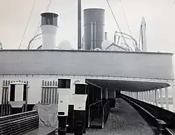 A powerful steam windlass was situated forward on the shelter deck for working the anchors, which were arranged to be stowed in hawse pipes, and two large capstans were fitted aft on the shelter deck for warping purposes.[4] A combined steam and hand steering engine was also located aft, and this was controlled by a telemotor gear from the navigating bridge.[4] There was also a powerful steering gear situated forward, the purpose of which was to operate a bow rudder so as to facilitate the quick turning and manoeuvring of the vessel when entering or leaving port.[4] For the stern rudder there was a combined steam and hand gear.