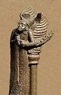Various sculptures and pillar capitals were found near the Heliodorus pillar in Besnagar, and it is thought they were dedicated to Vāsudeva's kinsmen, otherwise known as the Vrishni heroes and objects of the Bhagavata cult.[24] These are a tala (fan-palm capital), a makara(crocodile) capital, a banyan-tree capital, and a possible statue of the goddess Lakshmi, also associated with the Bhagavat cult.[25] Just as Garuda is associated with Vasudeva, the fan-palm capital is generally associated with Samkarsana, and the makara is associated with Pradyumna.[22][16] The banyan-tree capital with ashtanidhis is associated with Lakshmi.[25]