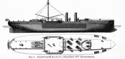 Stosch had instructed the design staff to begin work on the next corvette already in 1872, before they had been authorized under the 1873 fleet plan. Work on what became the Sachsen class continued into 1874.[5] Their roles imposed several design limitations on the vessels. The vessels were designed to operate in coastal areas, which required a shallow draft in order for them to be able to enter any port on the Baltic seaboard. They also required a heavy armament and think armor plate, in order for them to be able to engage any hostile ironclad on equal terms. Because Stosch envisioned only local deployments for the vessels, they did not need a high top speed or a long cruising radius. As a result, they had limited coal stowage, as they would operate close to their bases and could easily replenish fuel. A supplemental sailing rig was rejected for the same reason. Initially, 30.5 cm (12 in) guns were considered, but the design staff decided to use lighter 26 cm (10 in) guns instead. The designers adopted the basic format of the British breastwork monitors, but rather than employing the heavy gun turrets used in those vessels, the Germans opted for lighter open barbette mountings.[2][3]