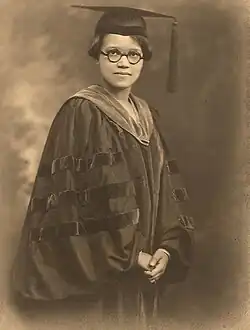Mossell returned to Philadelphia to study at the School of Education at the University of Pennsylvania, graduating in 1918. There, she faced numerous hardships, due to her race and gender, such as poor advising, false accusations of plagiarism, and other students stealing her intellectual property.[9] She pursued graduate work in economics, also at Penn, earning her master's in 1919. Awarded the Francis Sergeant Pepper fellowship, she was able to continue her studies and in 1921 became one of the first three African-American women to earn a PhD from an American university (along with Georgiana Simpson and Eva Beatrice Dykes, all within days of one another).[10][11][12][13]
