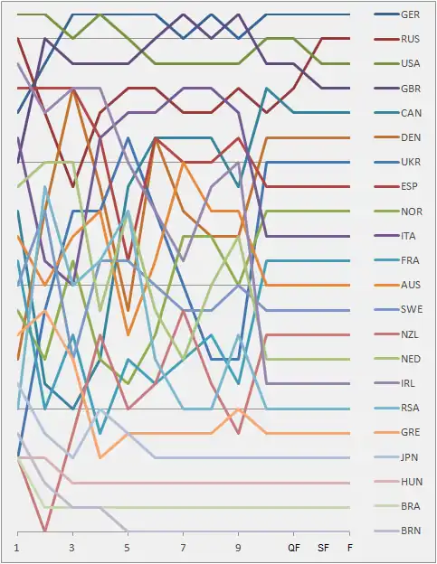| Rank | Country | Helmsman | Crew | Race 1 | Race 2 | Race 3 | Race 4 | Race 5 | Race 6 | Race 7 | Race 8 | Race 9 | Race 10 | Total | Total – discard | ||||||||||