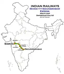 It operates as train number 17002 from Secunderabad Junction to Sainagar Shirdi and as train number 17001 in the reverse direction, serving the states of Telangana, Karnataka and Maharashtra. The train covers the distance of 777 km (483 mi) in 16 hours 12 mins approximately at a speed of 48 km/h (30 mph).[1]
