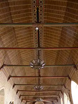 During the restoration of the church in the 19th century, the ceiling was repainted.[23] Like many Normandy churches, it is composed of painted paneling covering an inverted hull frame made up of four sections at different angles.[12]