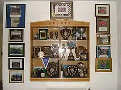 St. Cronan's has both Gaelic football and hurling teams which compete against other schools in the Wicklow area. The school's Gaelic football team have been county champions on several occasions, and have also won the Coughlin Cup on several occasions.[2] The school's team colours are blue, yellow, and white to match the school's uniform. Prior to the year 2000, the school's colours were red and white; this matched the colour of the previous school uniform.