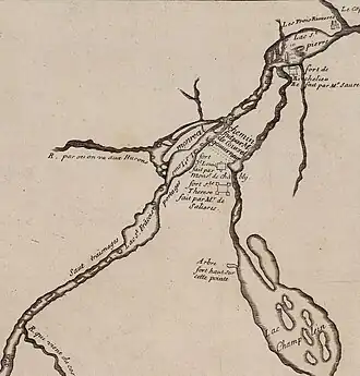Departing from Crown Point with four vessels and a number of bateaux on 2 June 1760.[10] A day later they landed fifty Rangers under Lieutenant Robert Holmes at Missisquoi Bay with orders to raid the French post known as 'Wigwam Martinique' on the Yamaska River east of the Richelieu river.[11] Another four Rangers were also dispatched overland to Quebec with a letter for Murray. A diversion was created - several vessels commanded by Captain Alexander Grant seconded to the Rangers from the 77th Highlanders attempted to distract the French further down the lake.[8] Rogers and the remaining 213 men crossed to the Northwest shore of Lake Champlain the next day and landed near Chazy River. Despite the diversion Bougainville soon learned of the Rangers location and sent out a party of 350 French, Canadian militia and Indians led by a Pierre Pepin LaForce to ambush the Rangers along the lake's shore.[12]