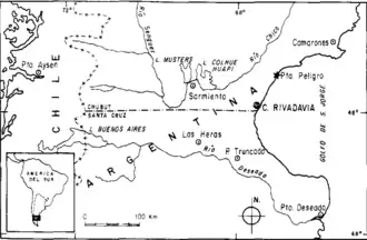 The Salamanca Formation crops out in the San Jorge Basin in southern Chubut and northern Santa Cruz provinces, Argentina, overlying the Cretaceous Chubut Group and is part of the Paleocene and Eocene Río Chico Group.[3][4][5][6] The formation yields abundant plant remains[7][8][9][10][11][12] as well as fossils of invertebrates, marine macrofaunas,[13] reptiles,[14][15][16][17][18] and mammals.[2][19][20][21][22][23][24][4][3] The formation consists primarily of estuarine to shallow marine deposits.[25][26]