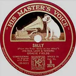 "Sally" is a popular song written by Leo Towers, Harry Leon and Will E. Haines. It was first sung by Gracie Fields in the 1931 film Sally in Our Alley.[1][2][3] "Sally" was released on His Master's Voice as the B-side of the record "Fall In and Follow the Band".[4]
