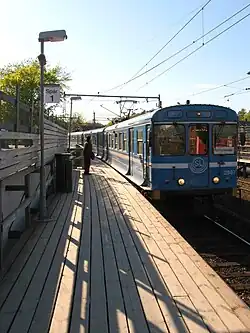 Saltsjöbanan (lit. 'the Salt Sea Line') is an electrified suburban rail system between Stockholm and Saltsjöbaden in Nacka, Sweden. It is 18.5 kilometres (11.5 mi) in length and has eighteen stations in use. An average of 17,200 boardings are made on an ordinary workday (2019). The line is mostly single-track (with passing loops between Nacka and Saltsjö-Järla, and between Storängen and Saltsjö-Duvnäs), and is isolated from Sweden's national railway network, although both are built to compatible 1,435 mm (4 ft 8+1⁄2 in) standard gauge. The Storstockholms Lokaltrafik (SL) classifies it as "light rail" in its maps.[4]