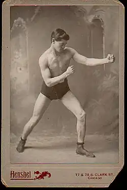 Much as he had with his paintings of rowers in the 1870s, during the late 1890s Eakins turned his interest again to the male nude, this time depicting prizefighters. Eakins attended fights in 1898, and aided by sportswriters Clarence Cranmer and Henry Walter Schlichter, met with and hired fighters to pose for him.[2]