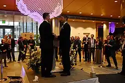 Opponents of the legalization of same-sex marriage delayed its implementation by collecting the signatures necessary to put the measure to a popular vote on November 6, 2012, as Referendum 74.[26] In that referendum, voters approved the law by a 54–46 percent margin.[27][28] The law took effect on December 6. Because Washington requires a three-day waiting period (excluding the day of issue) before a marriage license may be signed, the first same-sex marriages in the state took place on December 9, 2012.[29][30] Among the first couples to obtain marriage licenses were Lisa Brodoff and Lynn Grotsky in Olympia, the state capital, early on Thursday morning, December 6. In Seattle, about 150 same-sex couples lined up outside Seattle City Hall shortly before midnight, "waiting in a festive atmosphere for the doors to open" to obtain marriage licenses.[31] Jane Abbott Lighty and Pete-e Petersen were the first couple to obtain a license in King County.[32]
