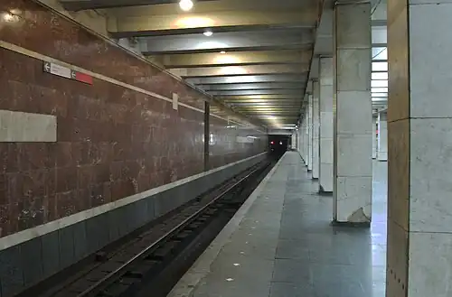 Samgori (Georgian: სამგორი) is a station of the Tbilisi Metro on the Akhmeteli–Varketili Line (First Line) situated between Isani and Varketili stations. It serves the district and the neighbourhood it is named after. Next to the station is the Tbilisi junction station of the same name of Samgori (alternatively called Navtlughi). The Samgori metro station has two main entrances, the one from Moscow ave and the one from Kakheti highway, connected with a tunnel that until the 90s had a travelator.[1] The station walls are decorated with relief images.[2] The station was opened on 5 May 1971 as an extension of the Didube300 Aragveli line.