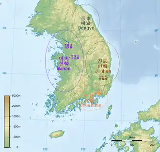 Samhan, or Three Han (Korean삼한; Hanja三韓), is the collective name of the Byeonhan, Jinhan, and Mahan confederacies that emerged in the first century BC during the Proto–Three Kingdoms of Korea, or Samhan, period. Located in the central and southern regions of the Korean Peninsula, the Samhan confederacies eventually merged and developed into the Baekje, Gaya, and Silla kingdoms.[1] The name "Samhan" also refers to the Three Kingdoms of Korea.[2]