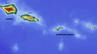 The Samoan Islands are in the central Pacific Ocean. They are volcanic in origin. The islands have a total area of 3,030 km2 (1,170 sq mi). The largest islands in the group are Savai'i and Upolu. The islands are politically divided between Samoa, an independent country; and American Samoa, an unincorporated territory of the United States.[1]