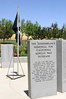• The California Korean War Veterans Memorial, erected in 1998. It consists of 16 five-foot-tall (1.5 m) granite monoliths arranged in a circle. Engraved on each monolith is the name of the 2,495 veterans from California who died during the Korean War.