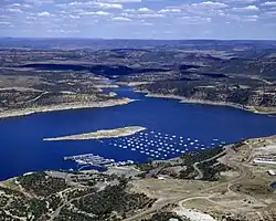 The big water projects in the San Juan River basin were mostly built by the U.S. Bureau of Reclamation after the 1950s as participating units of the Colorado River Storage Project, whose aim was to regulate the water supply of the upper Colorado River system, control floods and generate power. Navajo Dam, completed in 1963 after five years of construction, impounds 1.7 million acre-feet (2.1 km3) of water in Navajo Lake.[87] The dam serves for flood control, irrigation and long-term water storage, and its operations are paired with two major water projects of the upper San Juan River: the San Juan–Chama Project which diverts almost 100,000 acre-feet (0.12 km3) per year from the San Juan watershed to the Rio Grande system serving Albuquerque, New Mexico,[95] and the Navajo Indian Irrigation Project which provides water for 63,900 acres (25,900 ha) of farmland on the Navajo Nation.[96] These two projects together were designed to put to "beneficial use" the water allocated to New Mexico under the 1922 Colorado River Compact, which divided the waters of the Colorado River and its tributaries between the seven U.S. states that make up the Colorado River Basin.[97]