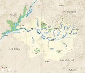 Tributaries of the upper San Juan River above Navajo Dam include the Rio Blanco and the Navajo River, and the Piedra River and Los Pinos River (Pine River) which join the San Juan in Navajo Lake. In addition to the Animas River, several major tributaries join below Farmington, including the La Plata River and Mancos River in New Mexico, and McElmo Creek in Utah.[6][8] San Juan also has a number of seasonal tributaries that drain arid regions of the Colorado Plateau. These include the Cañon Largo and Chaco River in New Mexico and the Montezuma Creek and Chinle Creek in Utah. The northern tributaries of the San Juan River, which originate in the San Juan Mountains, are snowmelt-driven, with the highest flows between March and June.[9] Southern tributaries such as the Chaco River are mostly ephemeral but can carry large volumes of water during flash floods.[8][10]