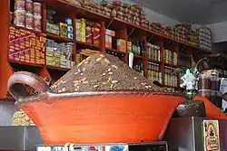 The community is best known for the preparation of mole, a traditional sauce that comes in a variety of flavors. Modern mole is derived from a pre-Hispanic preparation called "chilmulli," which in Nahuatl means "chili pepper sauce" During the colonial period, this sauce was modified mostly by adding ingredients such as nuts, peanuts, sesame seeds and spices such as cinnamon. While the flavors have multiplied and changed, the consistency of the sauce has remained the same.[1] Almost 92% of the community's population makes a living related to the preparation and sale of the sauce.[1] The moles of San Pedro Atocpan are not made in factories but rather in small family-owned enterprises.[6] Moles of different flavors, aromas, colors and textures are made, but the specialty is "mole almendrado" (almond mole), which was invented here and made with between 26 and 28 ingredients, always with a base of three chili peppers: mulato, pasilla and ancho. The recipe is well-guarded.[7] Many of these small businesses have networked to find ways to buy the more than twenty ingredients most moles need, such as chili peppers from Zacatecas, eliminating the need for middlemen. Each family in the town has its own recipes for the various types of moles. The family of Guadalupe Rios, for example, adds apple to her moles, presumably to avoid digestive problems.[1]
