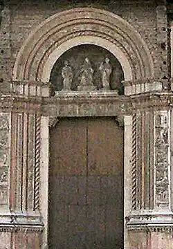 The main doorway (Porta Magna) was decorated by Jacopo della Quercia of Siena with scenes from the Old Testament on the pillars, eighteen prophets on the archivolt, scenes from the New Testament on the architrave, and a Madonna and Child, Saint Ambrose and Saint Petronius on the tympanum. It is flanked by two side doors, with Alfonso Lombardi's Resurrection on the left and Amico Aspertini's Deposition on the right.[3]