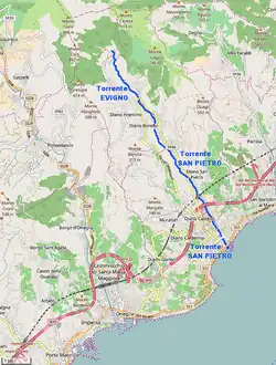 The creek is formed close to the village of Evigno (comune of Diano Arentino) from the union of several streams descending the south-eastern slopes of monte Torre (990 m).[2] Going SSW, a direction the creek will keep till to its mouth, it reaches Diano San Pietro where it gets from the left rio Beste, its main tributary. San Pietro watercourse marks for a long stretch the border between the comuni of Diano Castello (West side) and Diano San Pietro. Not faraway from its mouth, which is located in comune of Diano Marina, the San Pietro is crossed by Genoa–Ventimiglia railway, Autostrada dei Fiori and State highway nr.1 (Via Aurelia).