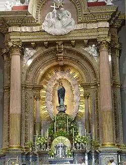Building the domed church started on 14 July 1863. On 28 August 1869 an outdoor shrine was dedicated. It incorporated a marble statue of Mary, work of a sculptor from Porto, Emidio Carlo Amatucci (1811-1872). Electrical failure was blamed for its being wrecked in 1883. Three years later a replacement had been found, the work of Antonio Teixeira Lopes. Developed over several decades, the religious complex at Sameiro also includes a venue for Mass in the Catholic Church, the Casa das Estampas, the Rector’s House, the Chapel of the Eucharist, the crypt under the church, and a grandiose flight of steps.[8] At the top are monuments to the Sacred Heart and the Immaculate Conception. Close to the grounds' entrance are four statues honouring theologians noted for their writings about Mary: Cyril of Alexandria, Alphonsus Liguori, Bernard of Clairvaux and Anthony of Padua.